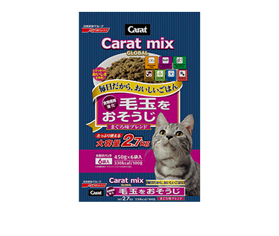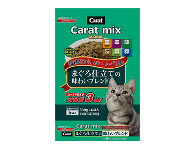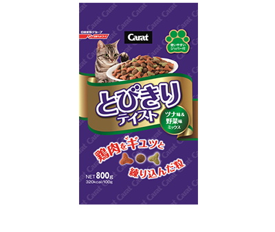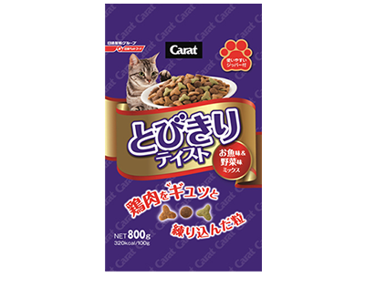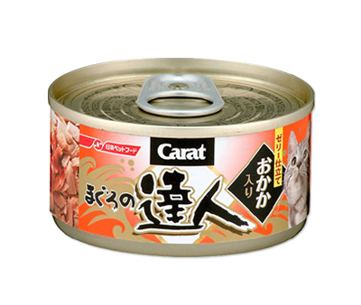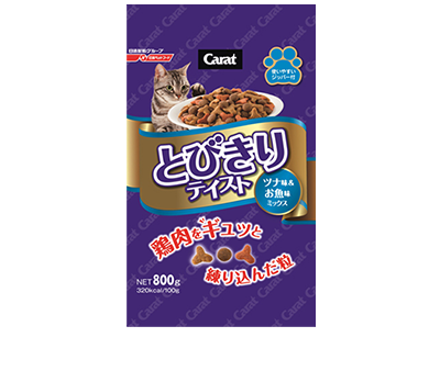 穀類(米粉、玉米、玉米蛋白粉),肉類(雞肉粉,雞肉),雞油,海鮮類(鮪魚、魚膠粉、白身魚肉萃取物),豆類(豆粕),胡蘿蔔素,礦物質(鈣、鉀、鈉、氯、鉄、銅、錳、鋅、碘、硒、鈷)維生素(A、D、E、K、B1、B2、B6、B12、泛酸、菸酸、葉酸、生物素、膽鹼) 氨基酸(蛋氨酸、牛磺酸),著色料(二氧化鈦、食用色素紅色102號、食用色素黃色5號、4號、食用色素藍色2號、1號) 抗氧化劑(混合生育酚、迷迭香抽出物)